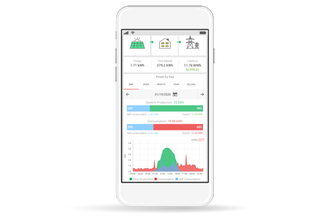 V aplikaciji mySolarEdge preko enotnih prikazov natančno vidite, kdaj in koliko energije proizvajate in koliko je porabite. Posledično lahko prilagodite svoje navade in maksimalno izkoristite proizvedeno sončno energijo.